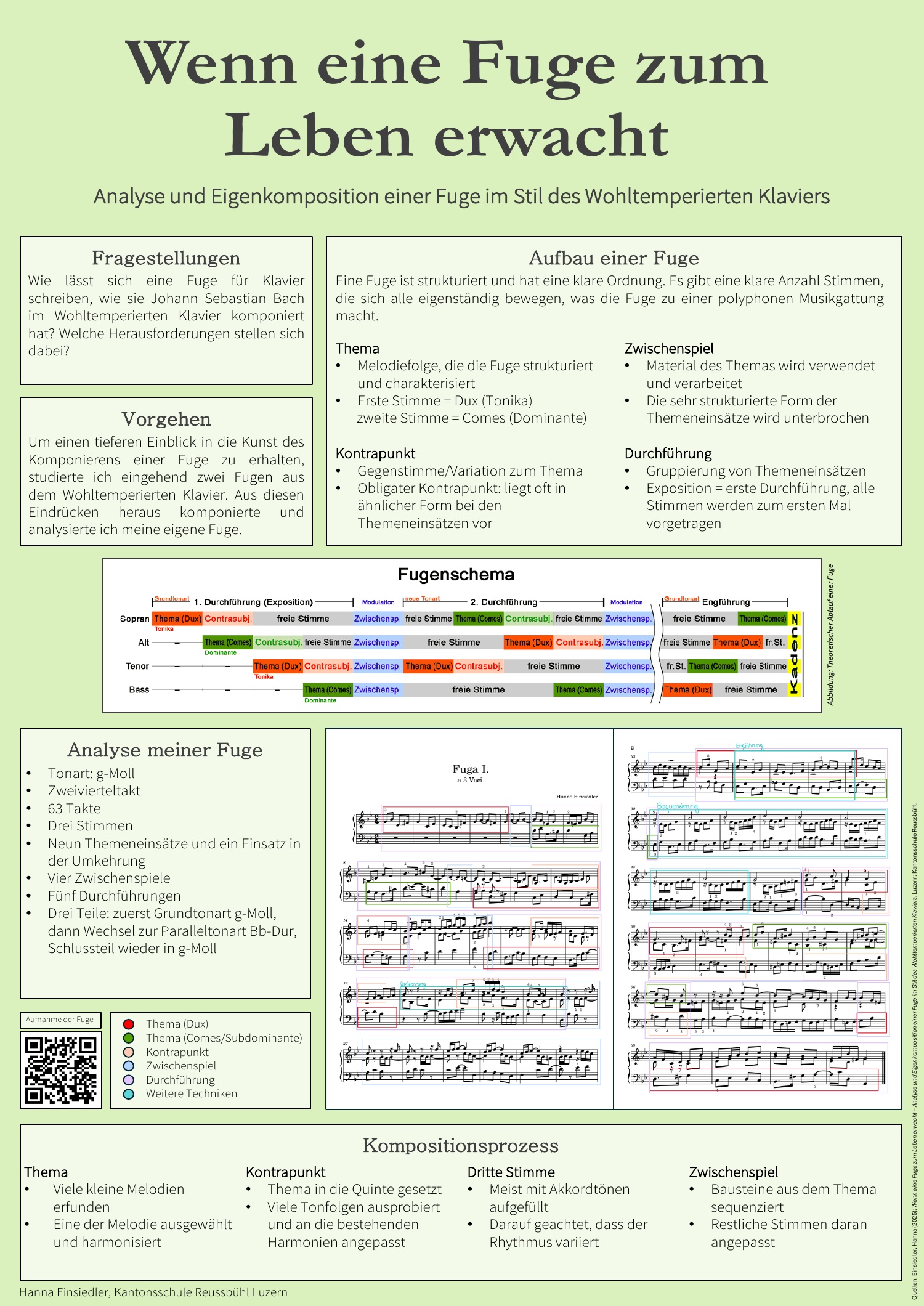 Im Zentrum stehen der Entstehungsprozess und die Analyse der von Hanna Einsiedler komponierten Fuge. Die Arbeit liefert dazu einen Einblick in die Welt des Komponierens im Stil von Johann Sebastian Bach und seinem Wohltemperierten Klavier durch Aufzeigen seiner Kompositionsmethode am Beispiel zweier Fugen.