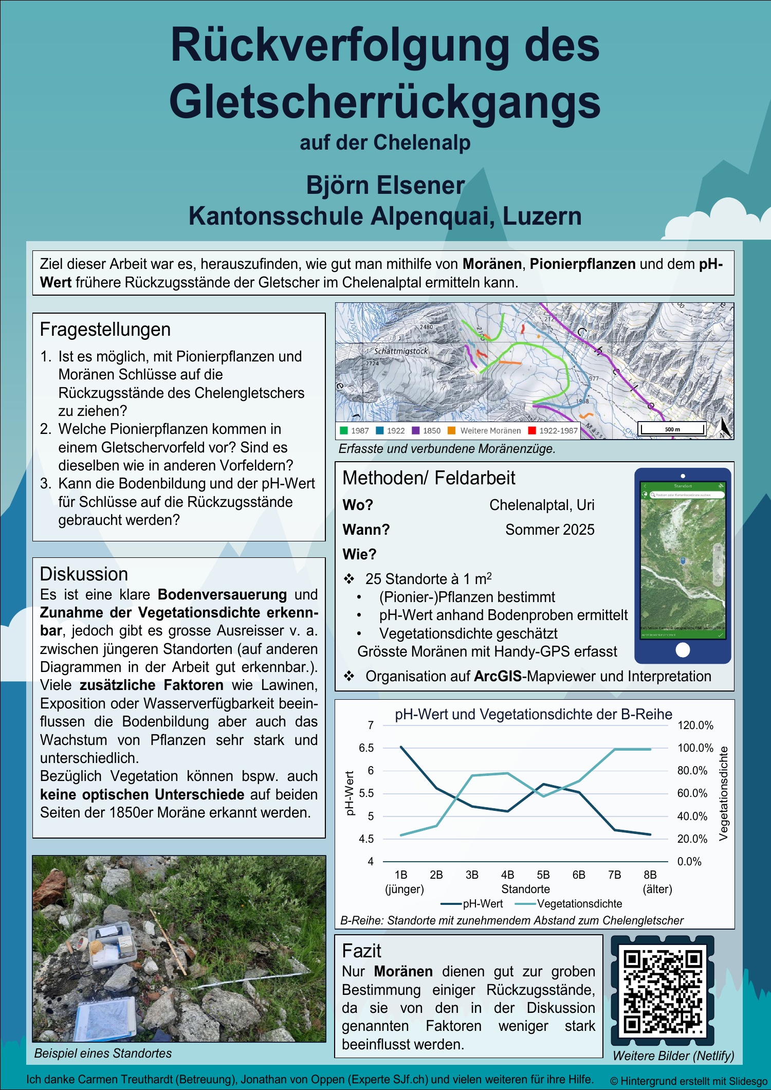 Die Messungen der pH-Werte, die Erfassung der Moränenstände mittels Survey und die Bestimmung der Pflanzen wurden methodisch durchdacht geplant, systematisch umgesetzt und kritisch reflektiert. Die Arbeit zeigt ein differenziertes Verständnis für Messunsicherheiten, Störeinflüsse und die Aussagekraft der erhobenen Daten. Die Resultate werden nachvollziehbar dokumentiert und fachlich korrekt eingeordnet.