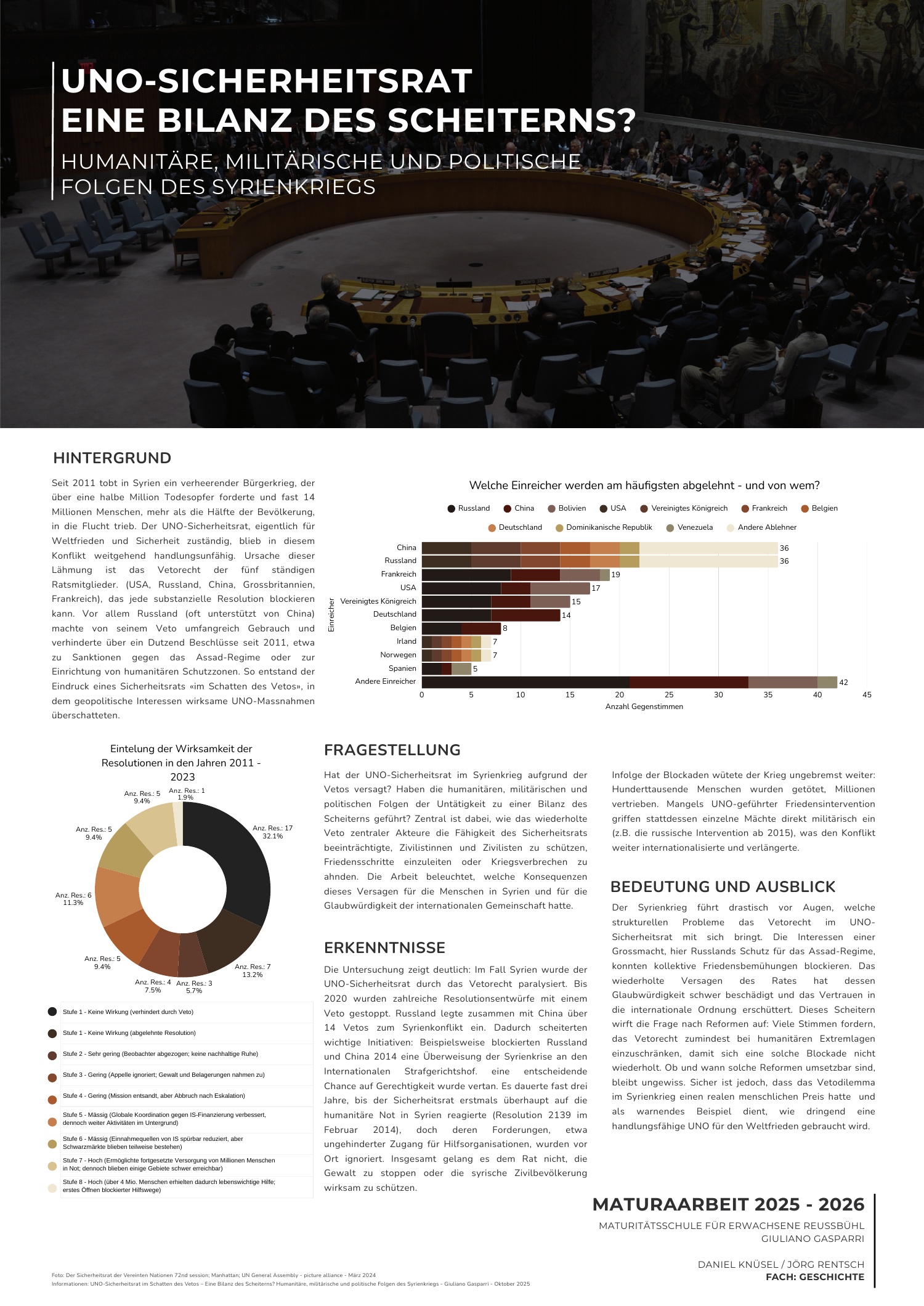 Resultat: Die detaillierte Datenauswertung zeigt, dass der wiederholte Einsatz des Vetorechts (primär Russland, China) substanzielle Eingriffe verhinderte und die Handlungsfähigkeit des Rates deutlich schwächte. Diese Vetos wirkten als politischer Schutzschirm und begünstigten den Machterhalt Assads, während der Sicherheitsrat nur punktuell humanitäre Erleichterungen erreichte. Der Konflikt nahm Züge eines Stellvertreterkrieges an, geopolitische Rivalitäten überlagerten normative Ziele, was die Lähmung des Rates und das Ausbleiben durchschlagender Beschlüsse erklärte.