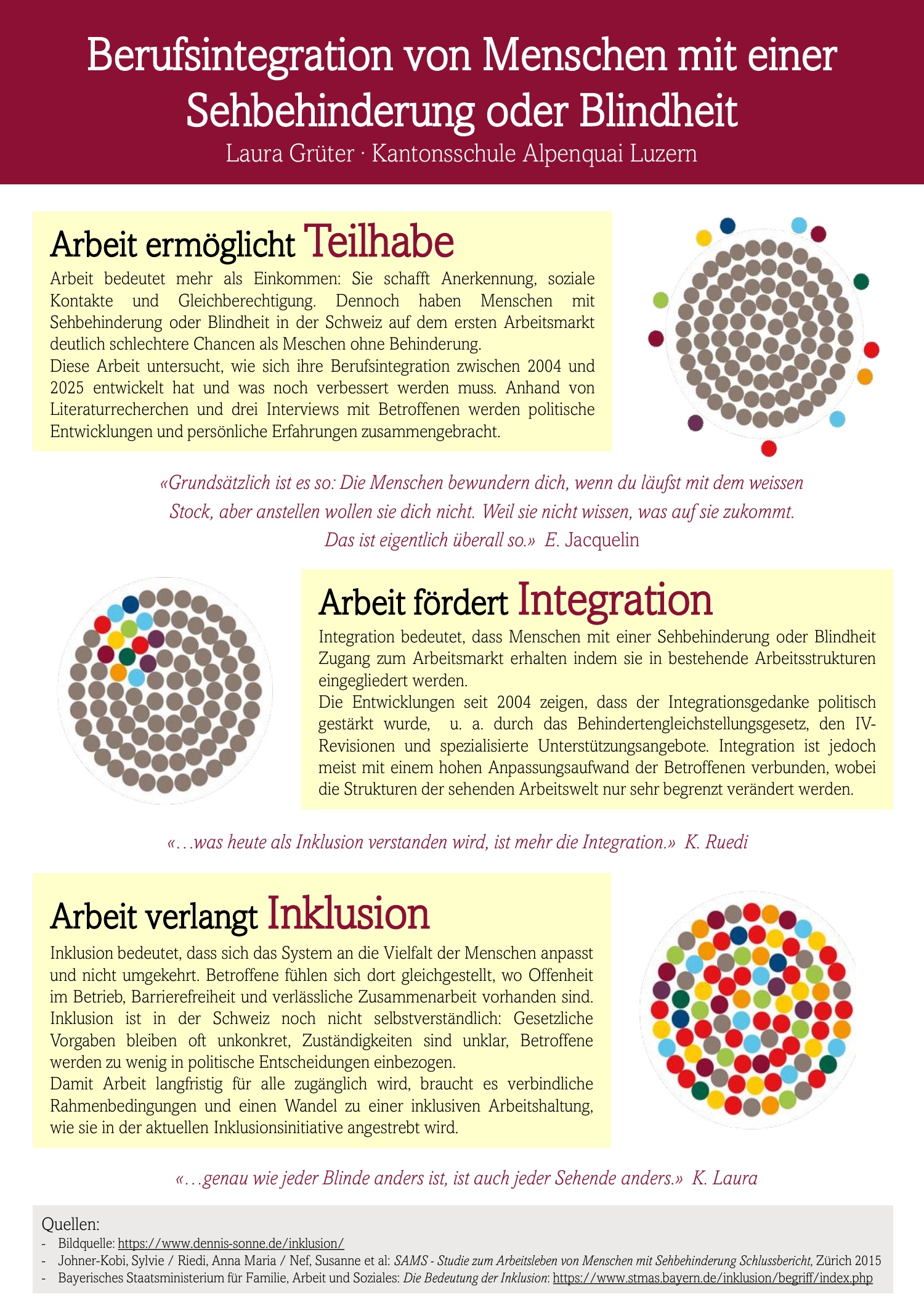Die Maturaarbeit von Laura Grüter untersucht die Entwicklung der Berufsintegration von Menschen mit Sehbehinderung oder Blindheit in der Schweiz im Zeitraum von 2004 bis 2025. Im Zentrum steht folgende Fragestellung: «Wie hat sich die Berufsintegration von Menschen mit Sehbehinderung oder Blindheit in der Schweiz verändert und was sollte noch erreicht werden?».