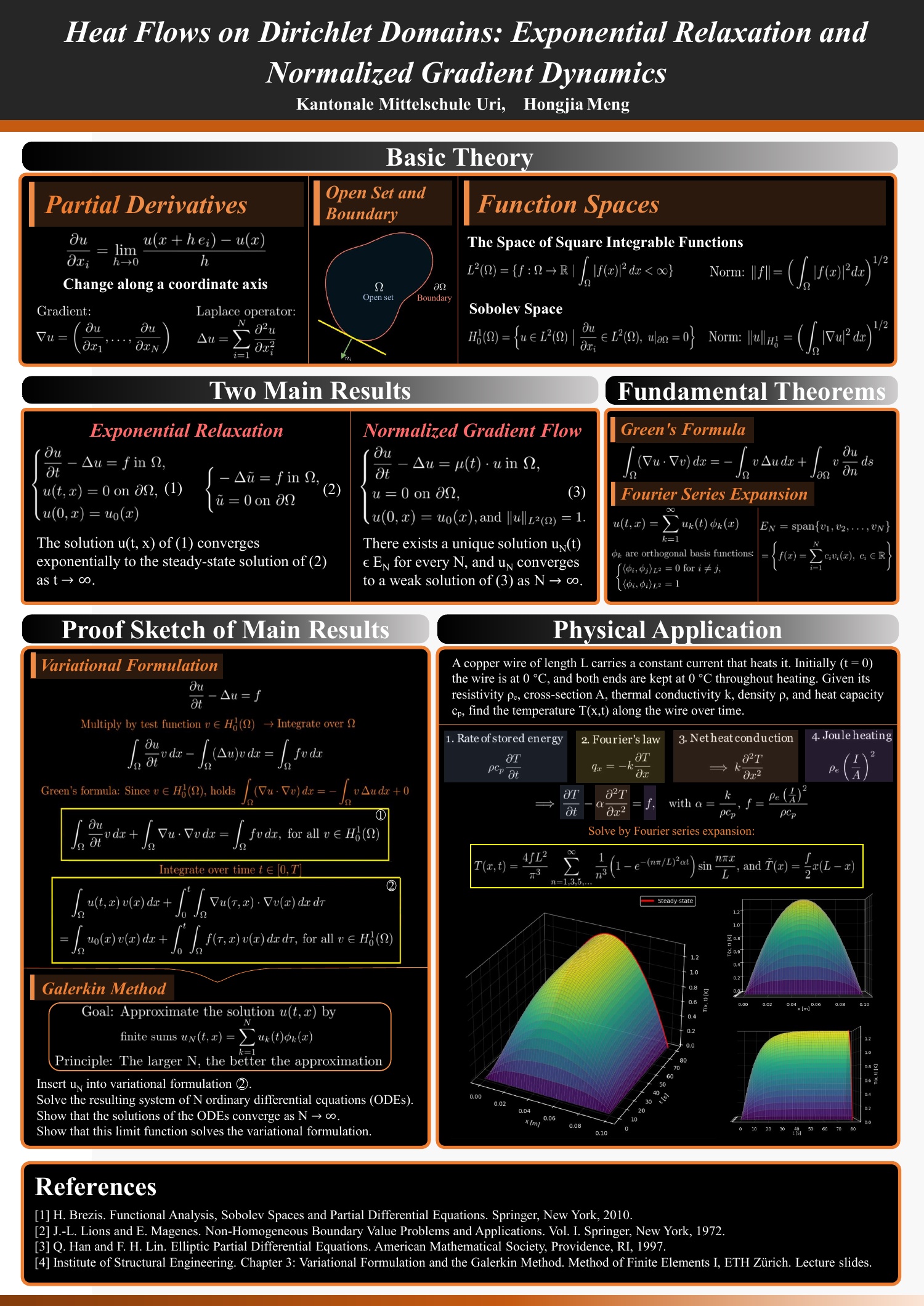 Die Maturaarbeit untersucht zwei zentrale Fragestellungen aus der Theorie partieller Differentialgleichungen auf Dirichlet-Domänen: das Relaxationsverhalten inhomogener Wärmeflüsse sowie die Dynamik eines normalisierten Gradientenflusses. Nach einer Einführung in die relevanten theoretischen Grundlagen werden Eigenschaften der Wärmeleitungsgleichung analytisch untersucht. Ein zentraler Bestandteil ist die numerische Simulation eines physikalischen Modells, mit der aus-gewählte theoretische Ergebnisse anschaulich verifiziert und illustriert werden. Darüber hinaus enthält die Arbeit einen umfangreichen Beweisteil, in dem die behandelten Aussagen mathematisch hergeleitet werden.