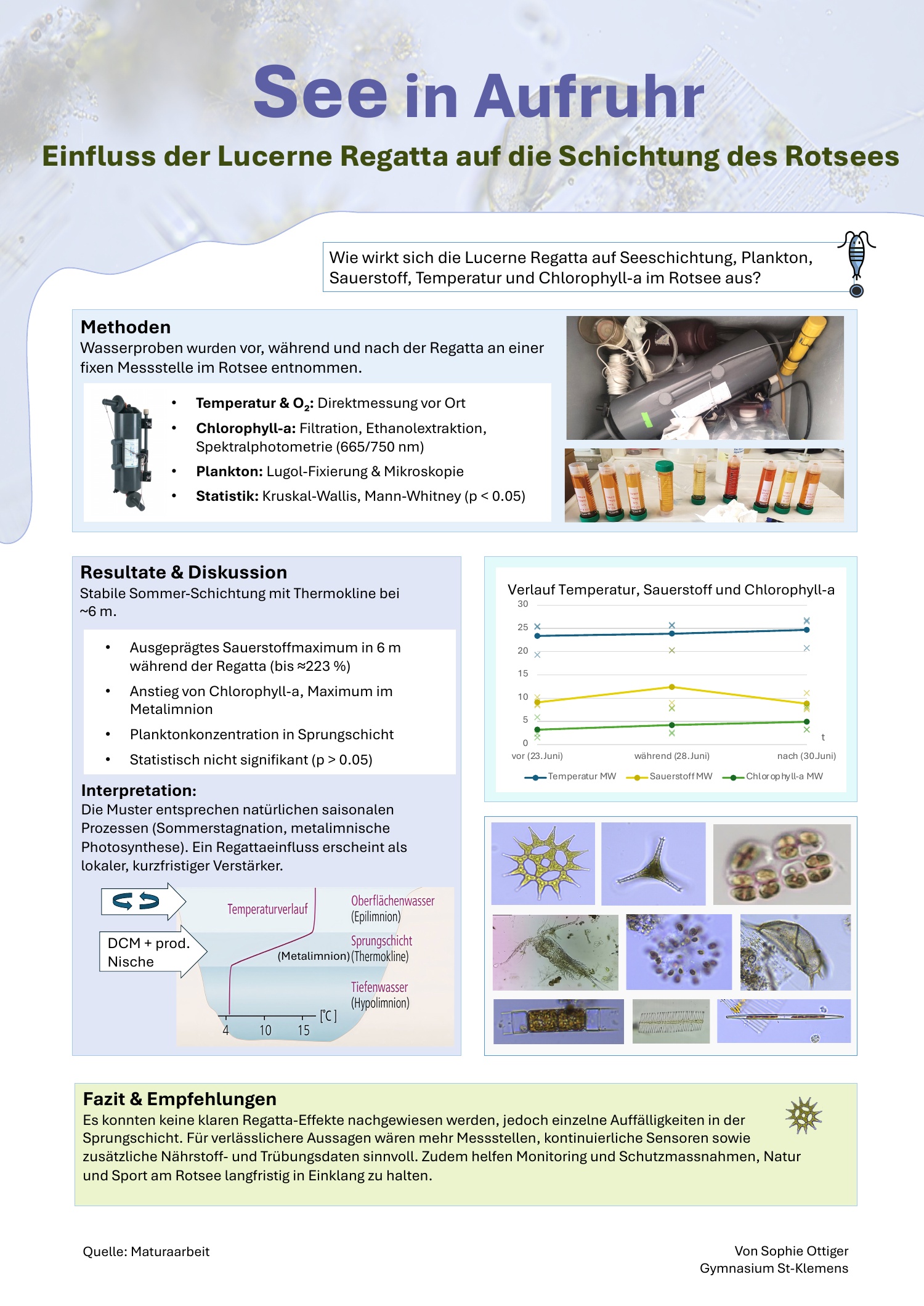 Der Rotsee ist Naturschutzgebiet und international bekannt als Rennstrecke des Rudersports. Diese Arbeit prüft, ob die Lucerne Regatta 2025 die Seeschichtung des Rotsees beeinflusst. Untersucht wurden Temperatur, Sauerstoff, Chlorophyll-a sowie Planktonzusammensetzung und -dichte. An drei Tagen vor, während und nach der Regatta wurden Proben in 1, 3 und 6 m Tiefe entnommen und analysiert.