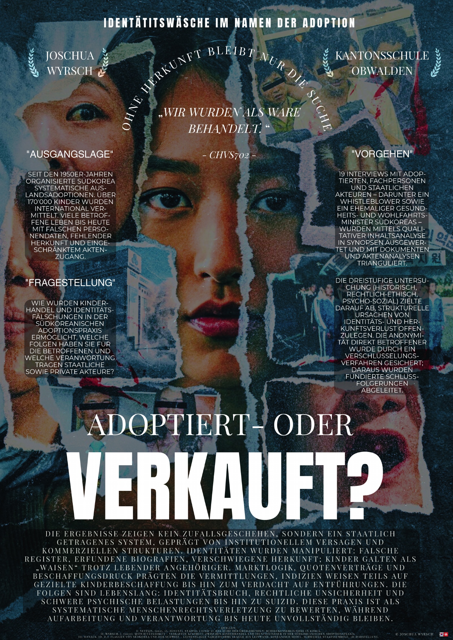 Die Arbeit von Joschua Wyrsch überzeugt durch aussergewöhnliche fachliche Tiefe, einen klaren persönlichen Bezug sowie durch hohe Ernsthaftigkeit und Eigenständigkeit. Mit klarer Projektabsicht, fundierter Theorie und einem anspruchsvollen qualitativen Vorgehen beleuchtet sie die südkoreanische Adoptionspraxis aus vielfältigen Perspektiven. Besonders beeindruckend sind die sorgfältig geführten Interviews, die sensible Auswertung sowie der stringente Projektbogen. Trotz Komplexität des fachlichen Verfahrens behielt Joschua Wyrsch stets den Überblick und arbeitete reflektiert, verantwortungsvoll und ausdauernd. Die Arbeit verbindet wissenschaftliche Präzision mit gesellschaftlicher Relevanz und persönlichem Engagement auf bemerkenswerte Weise.